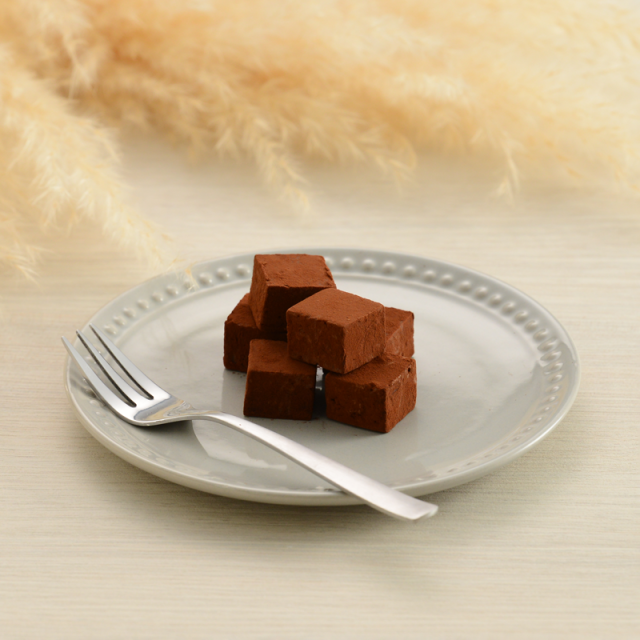 カカオ分40%以上配合で、ミルクのまろやかさとカカオの豊かな風味が特徴。湯煎で丁寧に溶かしたあと、生クリームやバターを加え、口の中でとろける食感に仕上げました。